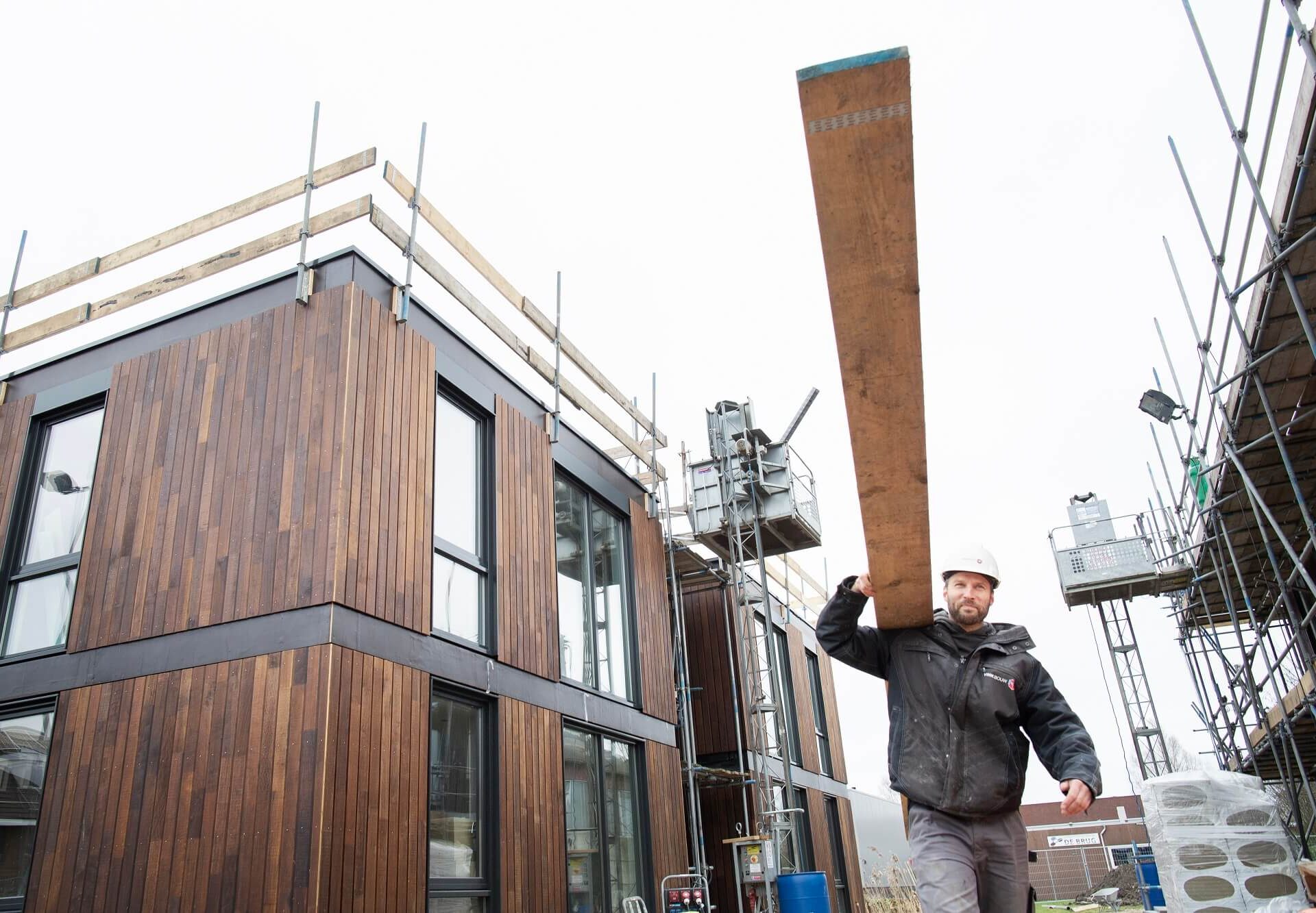 Hoewel de nieuwe woning van Wester nog volop gebouwd wordt, zie je meteen dat het om een biobased appartement gaat wanneer je de bouwplaats oploopt. De gevels van de twee appartementencomplexen in Nieuwkoop zijn volledig van hout. En dat is slechts het topje van de ijsberg, vertelt Wester: “De verdiepingsvloer, het dak, de wanden en de kozijnen… Ze zijn allemaal gemaakt van hout.”