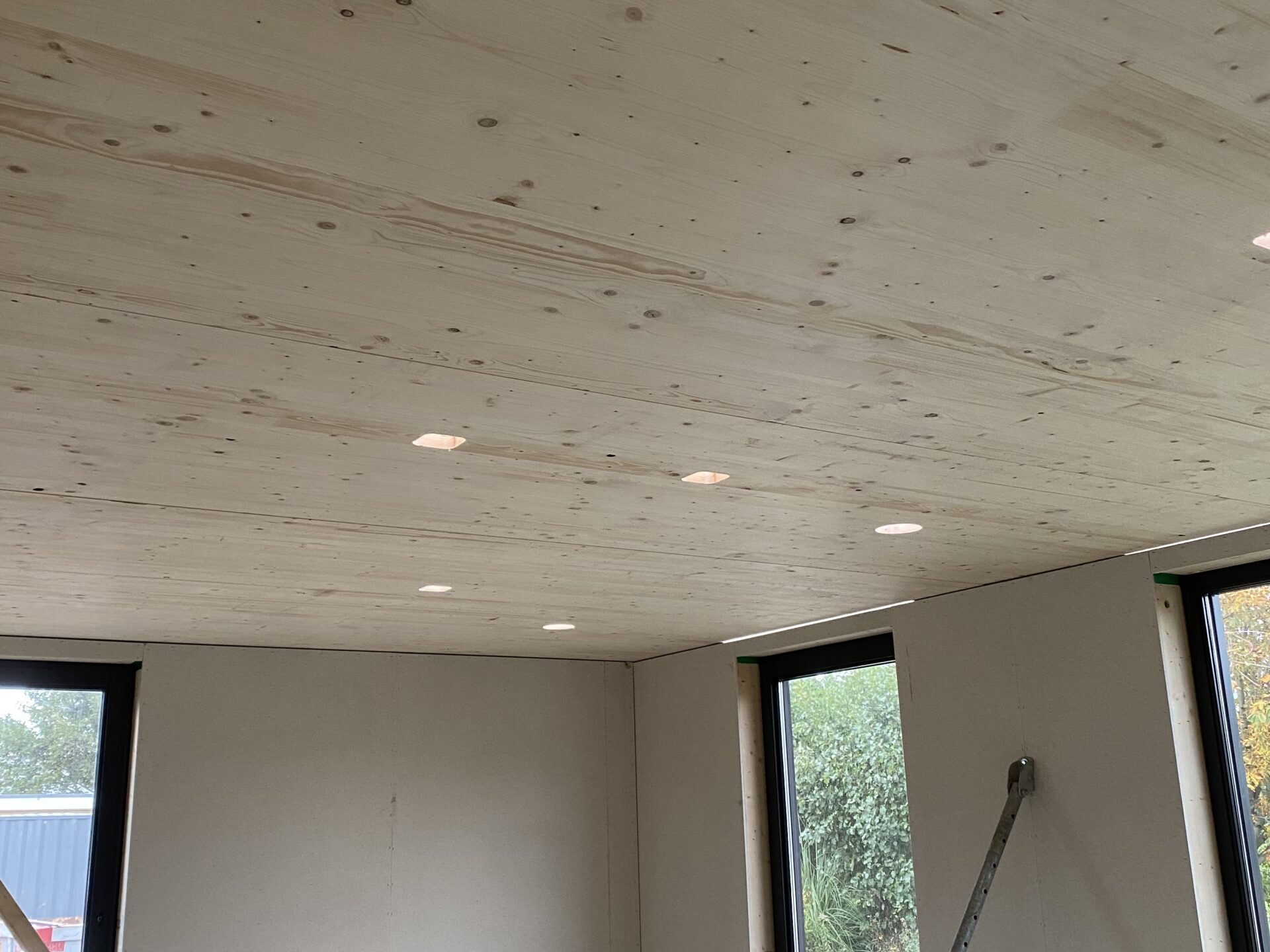 Het is toch gaaf om een houten plafond als eindlaag te hebben. In dat geval verdikken we de CLT plaat wegens de brandwerendheid en geldt dat gelijk als eindbeeld van het plafond.